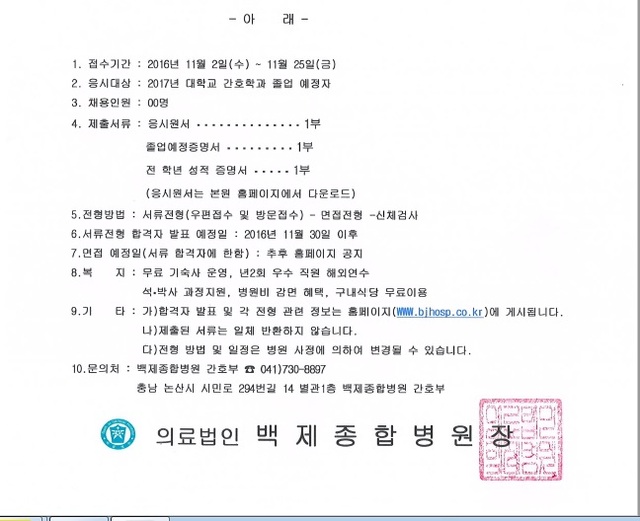 [채용공고] 백제종합병원 신규간호사 모집공고