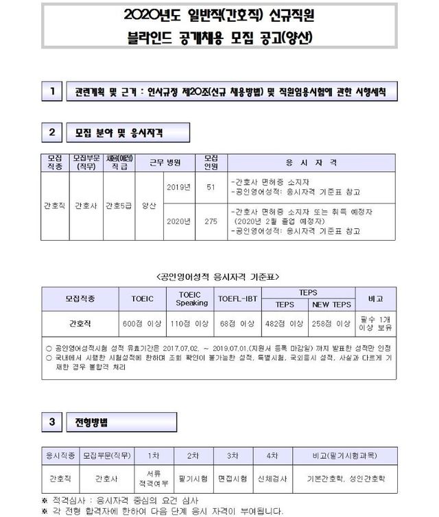 ◈채용공고◈ 양산부산대학교병원 2020년도 일반직(간호직) 신규직원 블라인드 공개채용 모집 공고(양산)