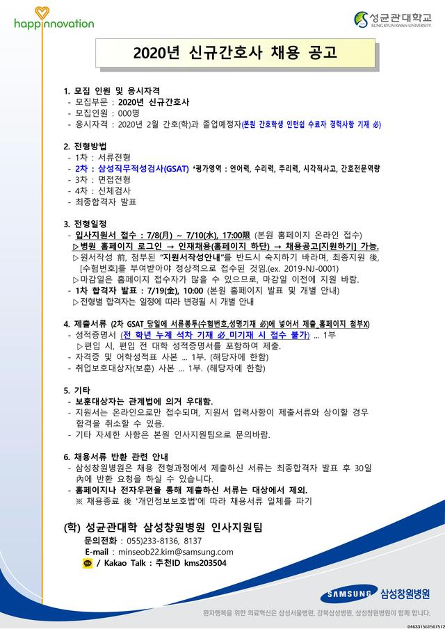 ◈채용공고◈ 성균관대학교 2020년 신규간호사 채용공고 안내