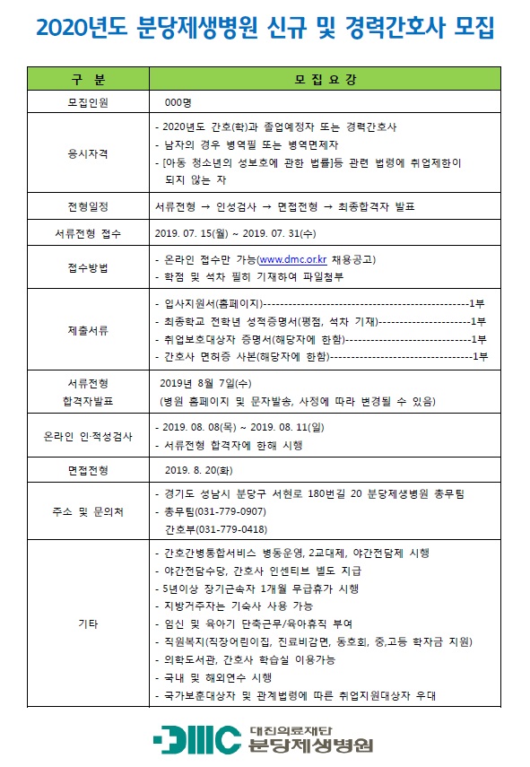 ◈채용공고◈ 분당제생병원 2020년도 신규간호사 및 경력간호사 모집 안내