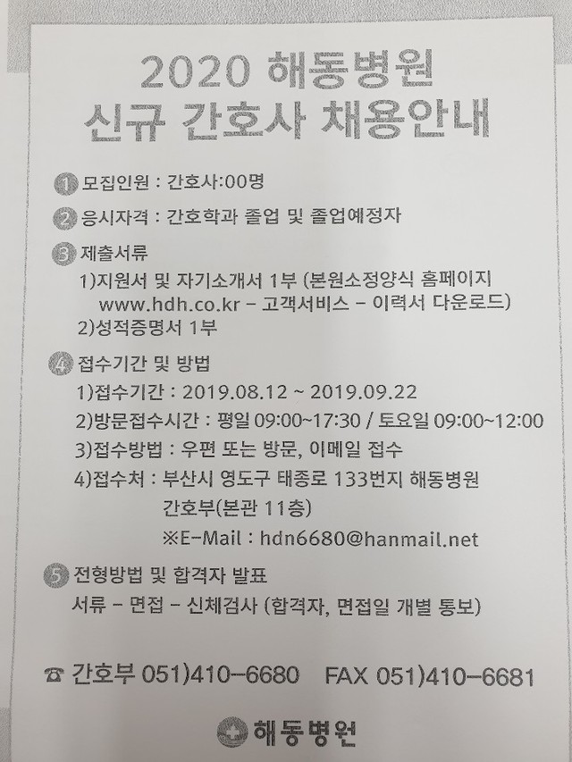 ◈채용공고◈ 2020 해동병원 신규간호사 채용안내