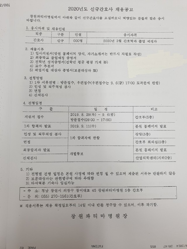 ◈채용공고◈ 창원파티마병원 2020년도 신규간호사 채용공고 안내