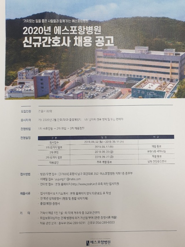 ◈채용공고◈ 에스포항병원 2020년 신규간호사 채용 공고 안내