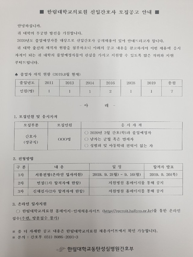 ◈채용공고◈ 한림대학교의료원 신입간호사 모집공고 안내