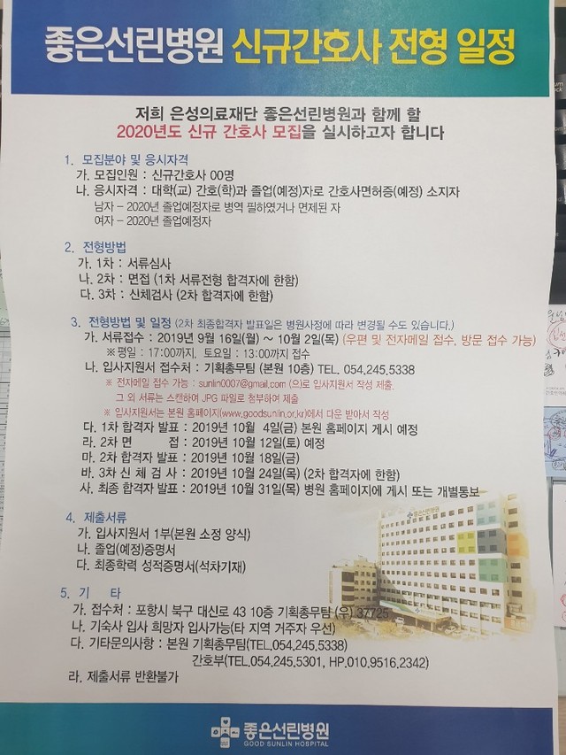 ◈채용공고◈ 2020년 좋은선린병원 신규간호사 모집 안내