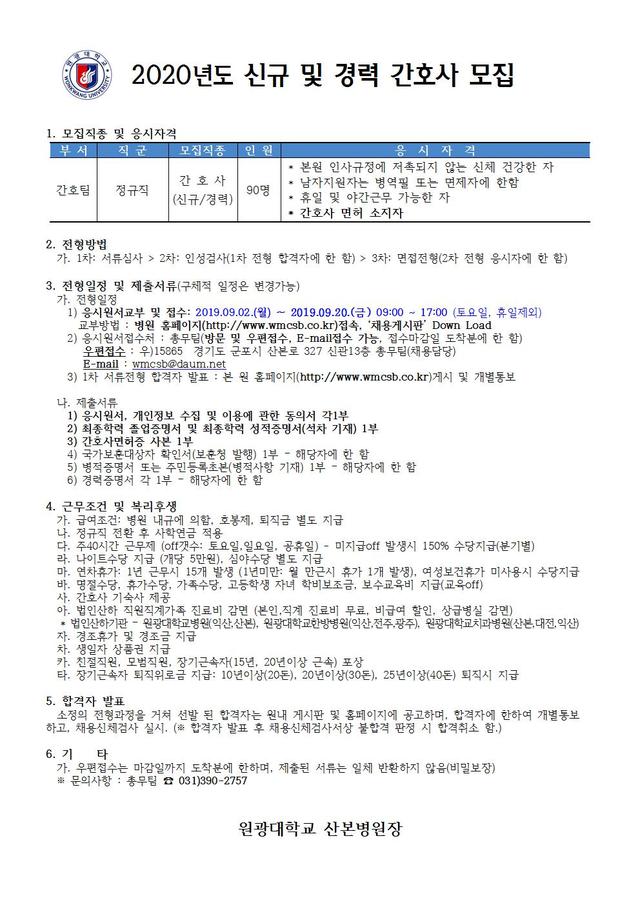 ◈채용공고◈ 원광대학교산본병원 2020년도 신입 및 경력 간호사 모집