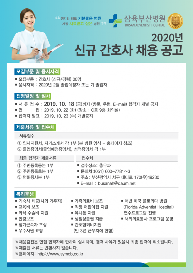 ◈채용공고◈ 삼육부산병원 2020년 신규간호사 채용공고 안내