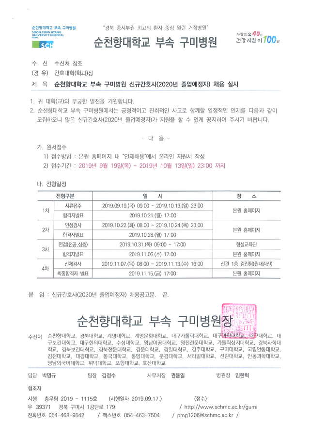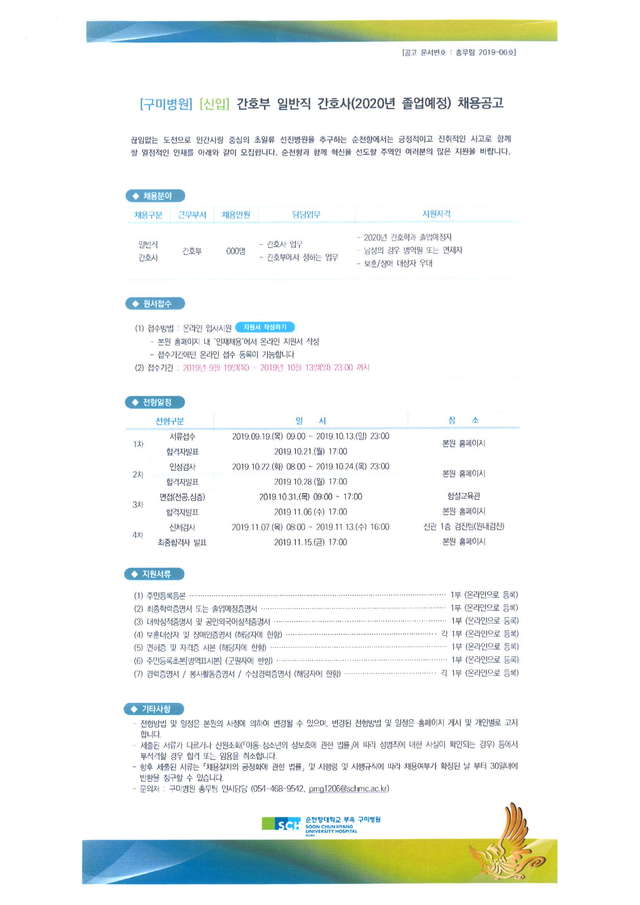 ◈채용공고◈ 순천향대학교 부속 구미병원 2020년도 신입 간호사 모집 안내