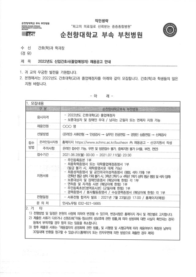 ◈채용공고◈ 순천향대학교 부속 부천병원 2022년도 신입간호사(졸업예정자) 채용공고 안내