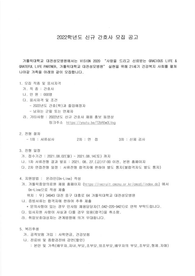 ◈채용공고◈ 가톨릭대학교 대전성모병원 2022학년도 신규간호사 모집 공고 안내