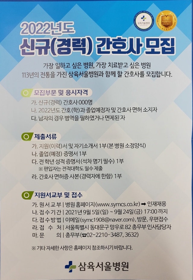 ◈채용공고◈ 삼육서울병원 2022년도 신규(경력) 간호사 모집 안내