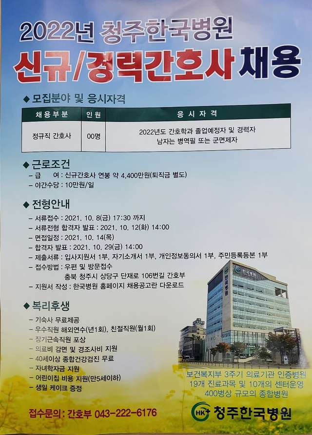 ◈채용공고◈ 2022년 청주한국병원 신규/경력간호사 채용 안내