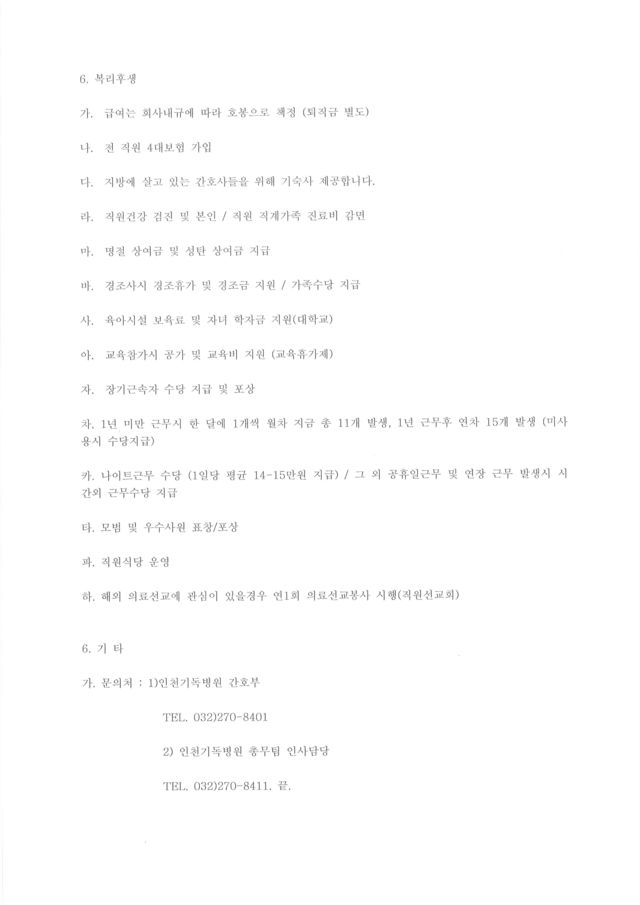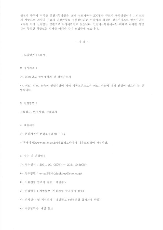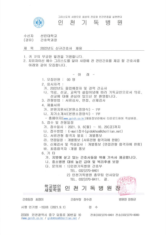 ◈채용공고◈ 인천기독병원 2022년도 신규간호사 채용안내