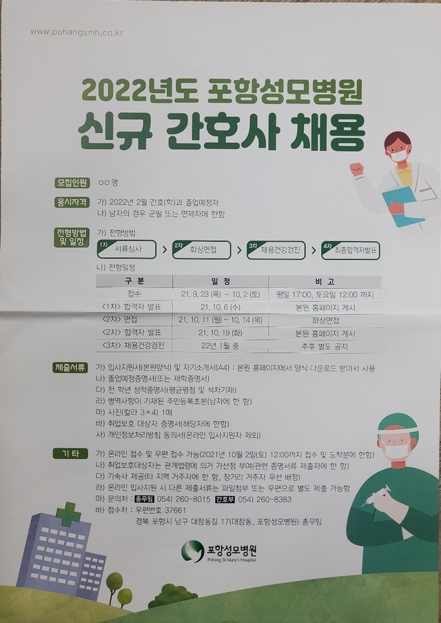 ◈채용공고◈ 2022년도 포항성모병원 신규간호사 채용 안내