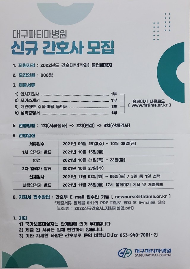 ◈채용공고◈ 대구파티마병원 신규간호사 모집 안내