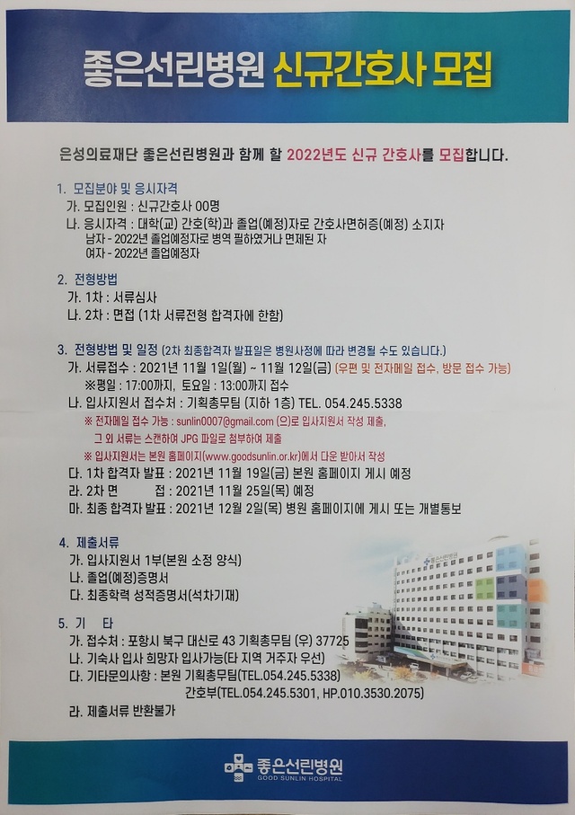 ◈채용공고◈ 좋은선린병원 신규간호사 모집 안내