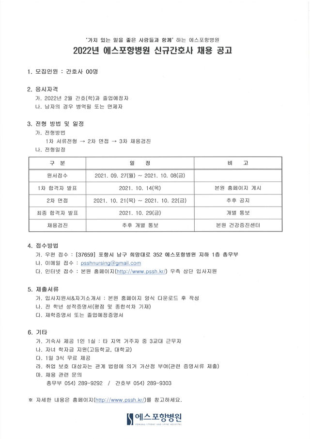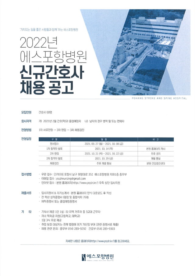 ◈채용공고◈ 2022년 에스포항병원 신규간호사 채용 공고 안내