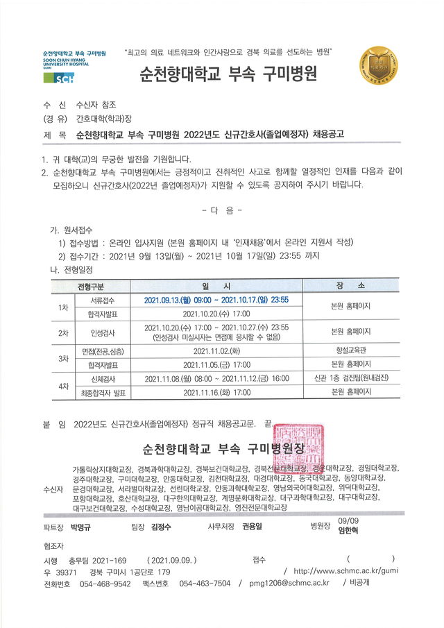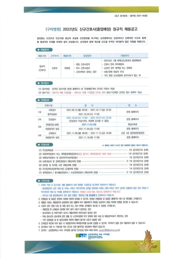 ◈채용공고◈ 순천향대학교부속구미병원 2022년도 신규간호사(졸업예정자) 채용공고 안내