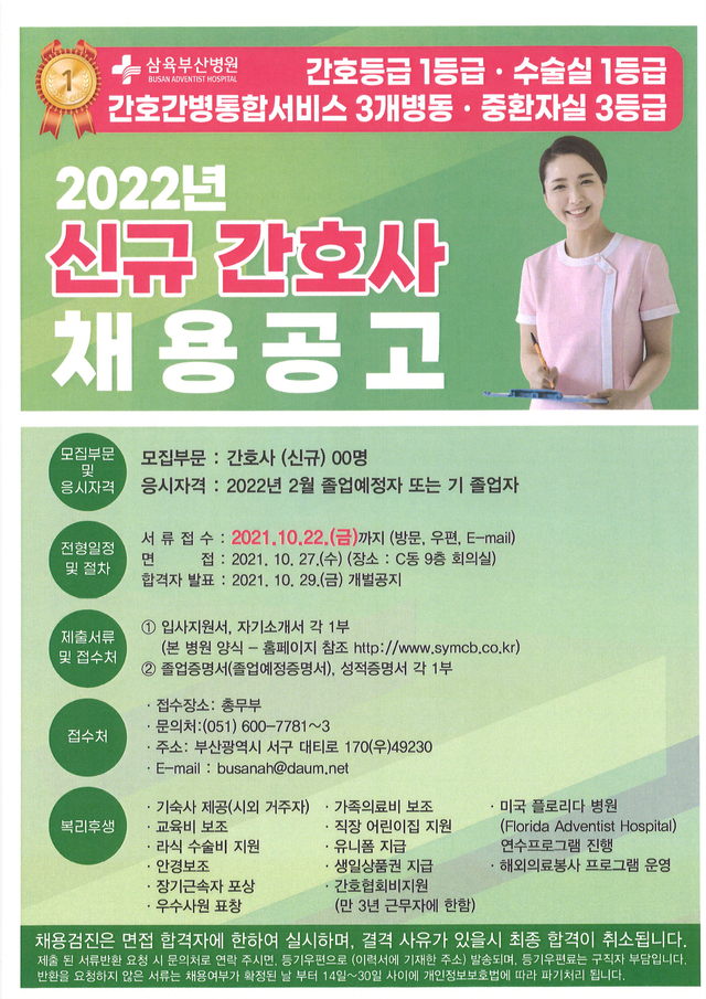◈채용공고◈ 삼육부산병원 2022년 신규간호사 채용공고 안내