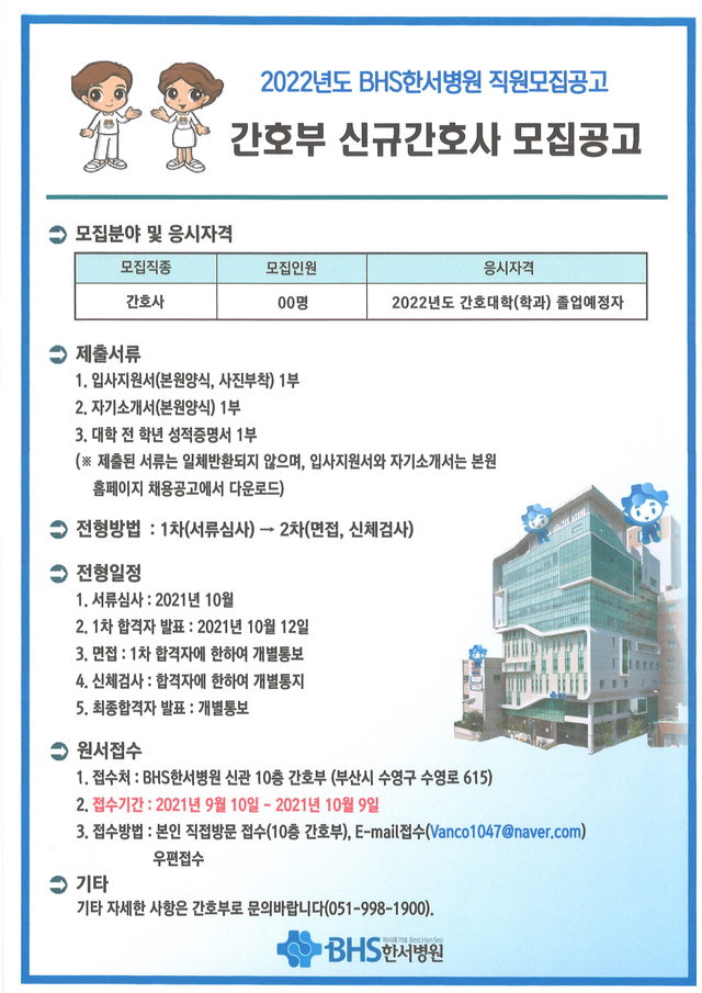 ◈채용공고◈ 2022년도 BHS한서병원 간호부 신규간호사 모집 공고 안내
