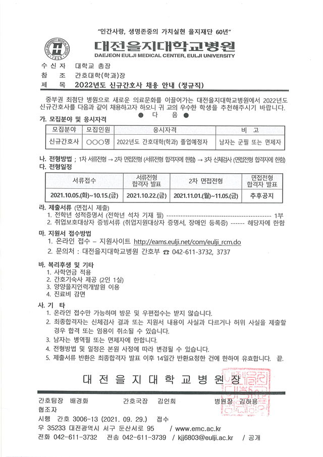 ◈채용공고◈ 대전을지대학교병원 2022년도 신규간호가 채용 안내(정규직)