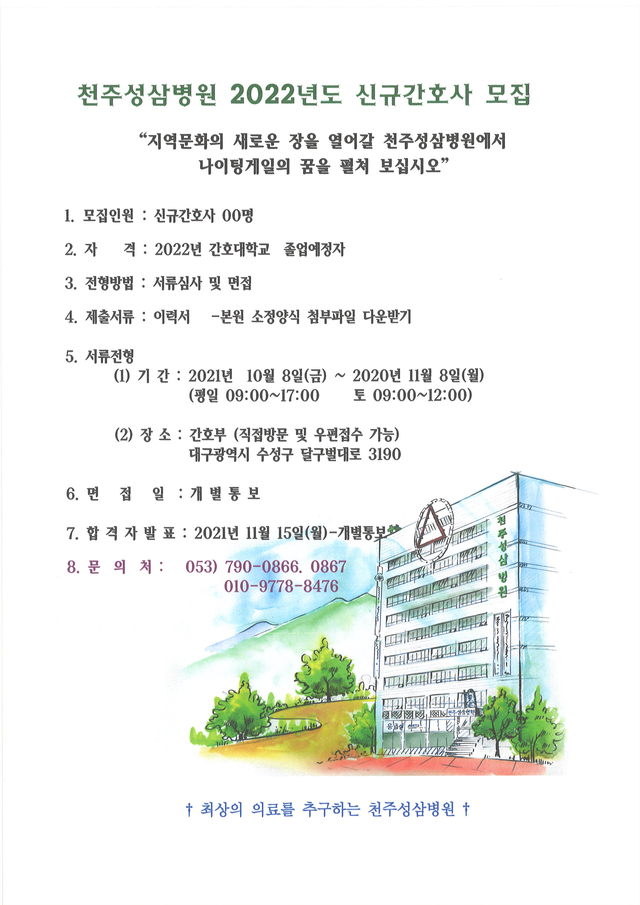 ◈채용공고◈ 천주성삼병원 2022년도 신규간호사 모집 안내