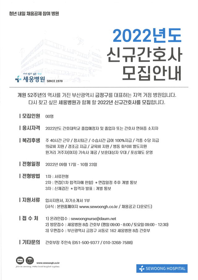 ◈채용공고◈ 세웅병원 2022년도 신규간호사 모집 안내