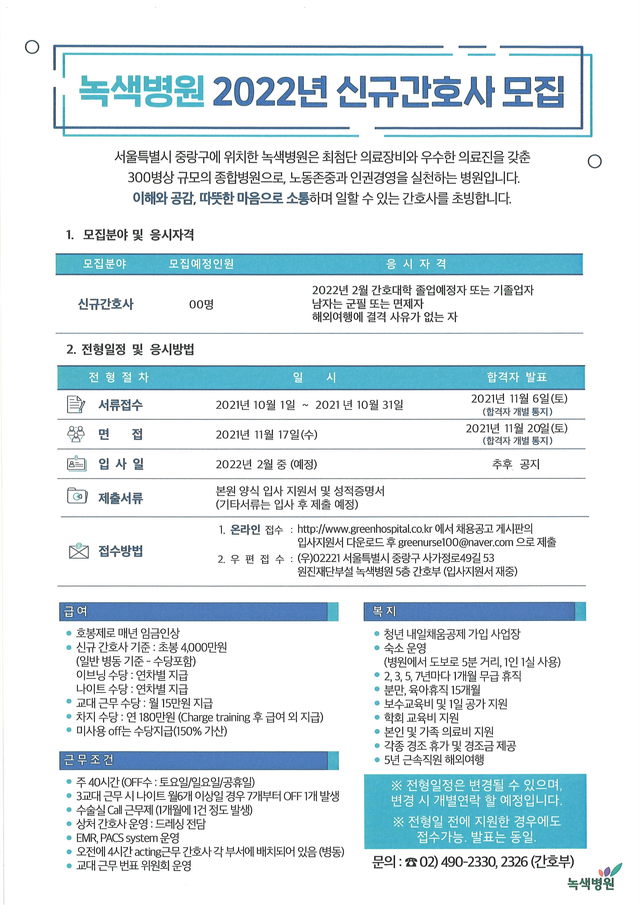 ◈채용공고◈ 녹색병원 2022년 신규간호사 모집 안내