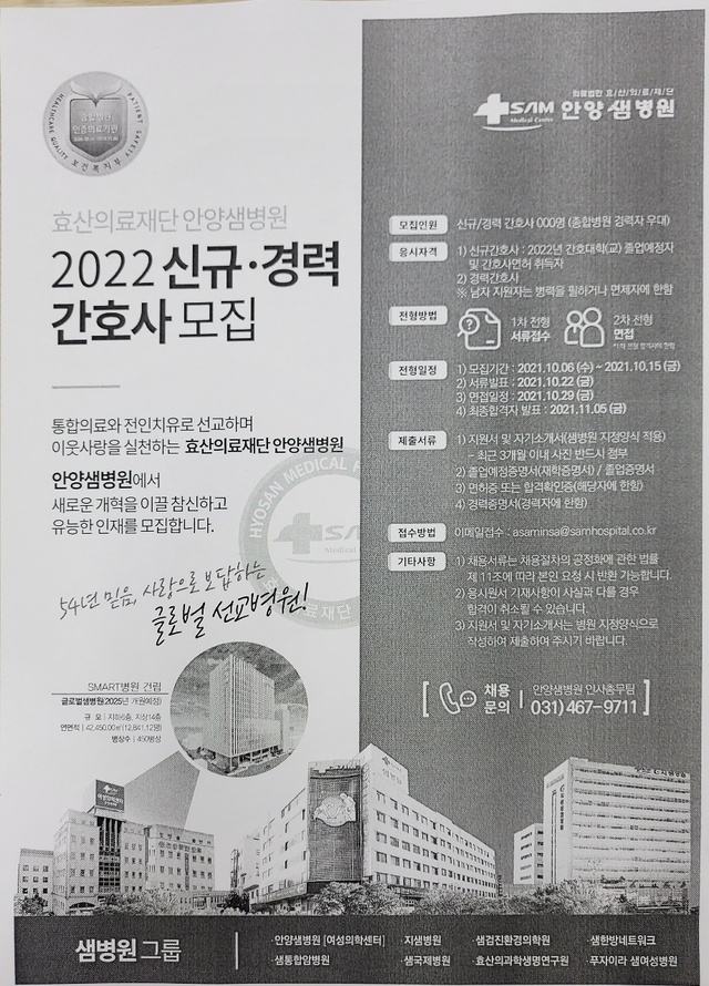 ◈채용공고◈ 안양샘병원 2022 신규.경력 간호사 모집 안내