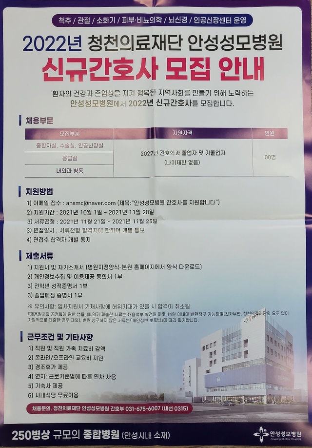 ◈채용공고◈ 2022년 청천의료재단 안성성모병원 신규간호사 모집 안내
