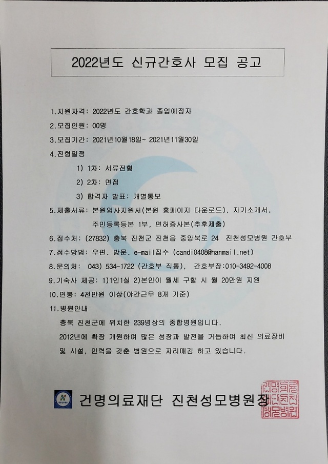 ◈채용공고◈ 진천성모병원 2022년도 신규간호사 모집 공고