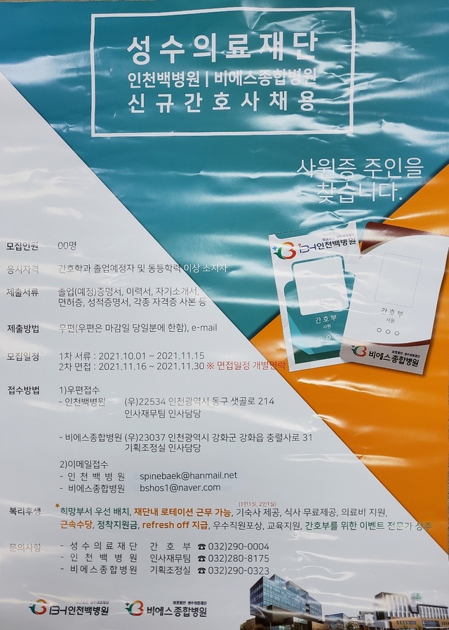 ◈채용공고◈ 성수의료재단 인천백병원/비에스종합병원 신규간호사 채용 안내