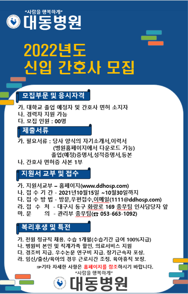 ◈채용공고◈ 대동병원 2022년도 신입 간호사 모집 안내