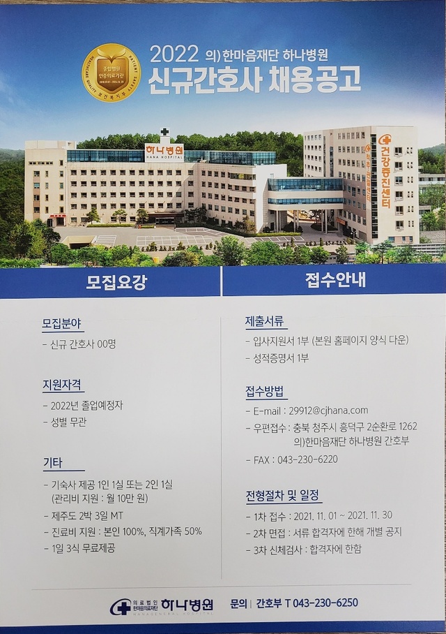 ◈채용공고◈2022 의)한마음재단 하나병원 신규간호사 채용 공고