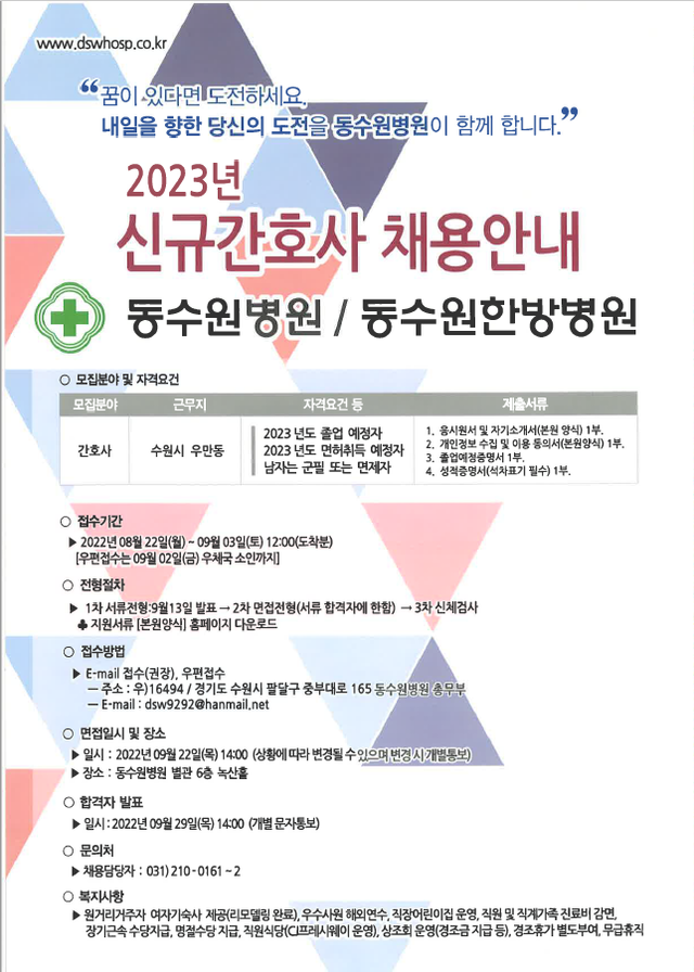 ◈ 채용공고 ◈ 동수원병원 2023년도 졸업예정자 신규간호사 모집