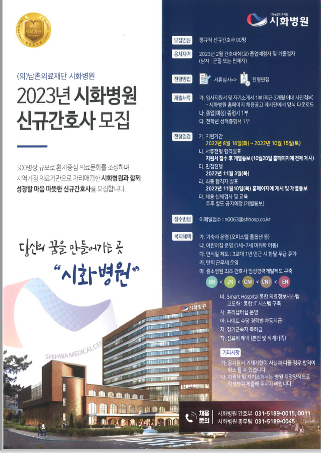 ◈ 채용공고 ◈ 남촌의료재단 시화병원 2023년도 신규간호사 모집