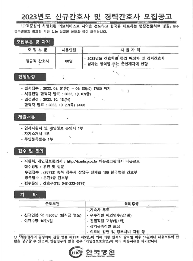 ◈ 채용공고 ◈ 2023년도 한국병원 신규간호사 및 경력간호사 모집공고