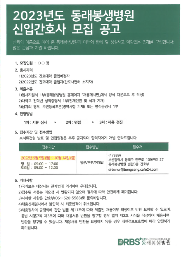 ◈ 채용공고 ◈ 2023년도 동래봉생병원 신입간호사 모집 공고