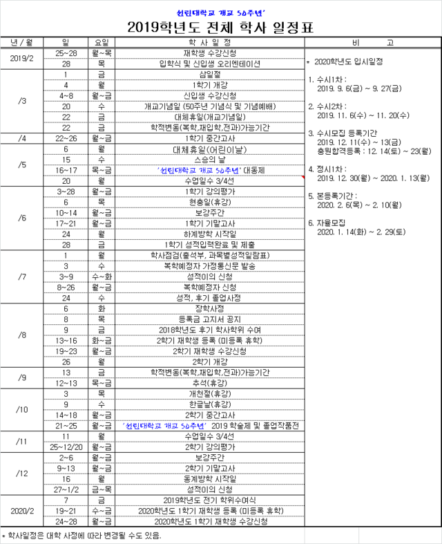 2019학년도 전체 학사 일정표