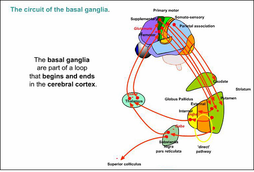 - Excitation of the striatum in one motor circuit decreasing this inhibition focally thus "releasing the brake" for the selected movement.